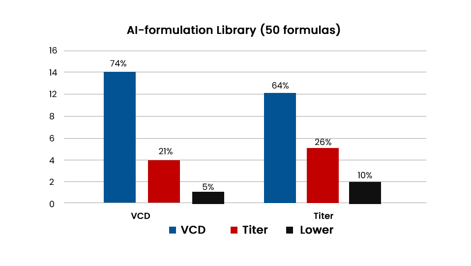 Using an AI-generated library of 50 media formulations, 64%–74% of tested formulations demonstrated superior VCD or titer performance compared with a commercial control.